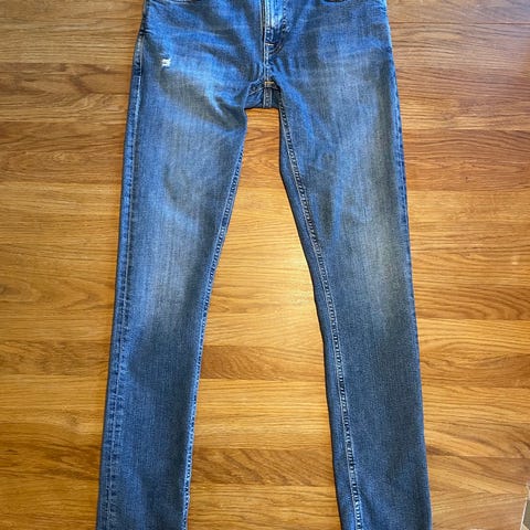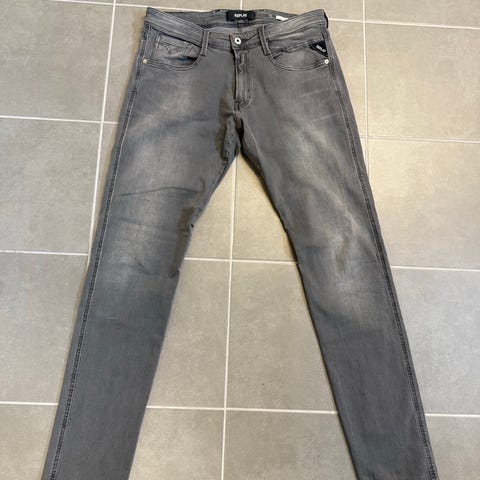 Ett par Replay Anbass Slim Fit jeans. Jeansen har en klassisk design med fem fickor och bälteshällor. De har en knapp- och dragkedjegylf.