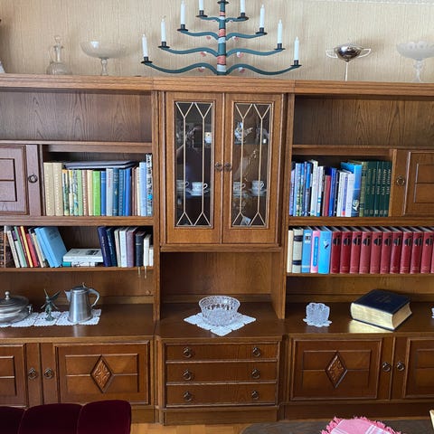 Mörk ek gammal bokhylla/ skåpsvägg med inbyggd belysning.