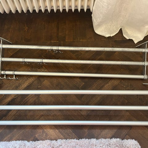 Hatthylla i ek och aluminium som var uppsatt i nyproduktion vid köp. Endast nedskruvad så aldrig riktigt använd. Gott skick inga synliga skavanker.