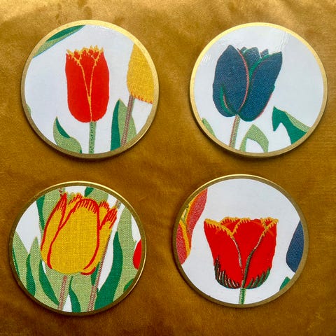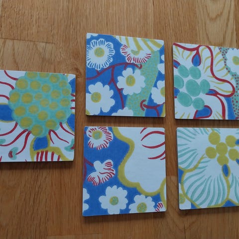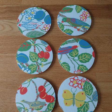 6st nya glasunderlägg med hållare som jag tapetserat med laminerad tapet Svenskt Tenn Josef Frank Eldblomman blå.Laminering är livsmedelssäker,slitstark och lätt avtorkningsbar.