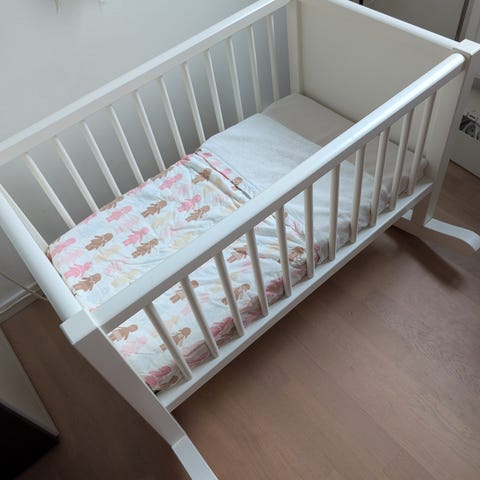 IKEA vagga för barn, tillverkad i trä med naturfärgad finish. Sängen har ribbotten och medar som gör att den kan gungas fram och tillbaka. Passar som sovplats för spädbarn och mindre barn. Klassisk design med höga gavlar och dekorativa knoppar i hörnen. Madrass ingår inte, utan behöver kompletteras separat efter önskad storlek och tjocklek.