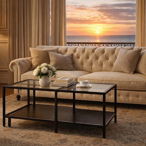 IKEA soffbord med svart metallstomme och ovanskiva i glas. Underskiva i svart material ger extra avställningsyta för till exempel tidningar, böcker eller korgar. Passar som vardagsrumsbord eller sidobord i olika typer av inredningar.