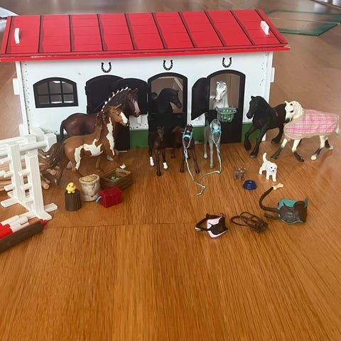 Bondgård / stall märke Micki samt massor med djur och ryttare.