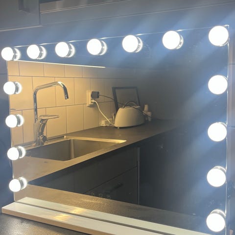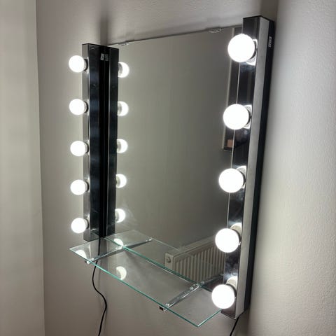 Sminkspegel med belysning och vägghylla.