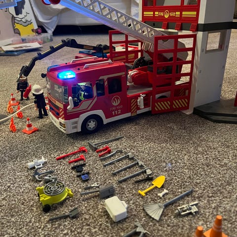 Playmobil polisstation lekset med polisbyggnad, fordon och figurer. Setet innehåller en större polisstation med flera våningar, cell, inredning och gångbroar.