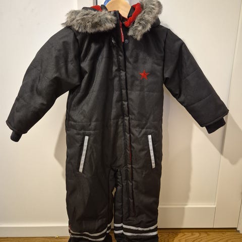 Overall i blå färg, avsedd för unisex. Modellen har huva med fuskpäls, långa ärmar och ben samt dragkedja framtill. Passar som ytterplagg vid kallare väder och utomhuslek.