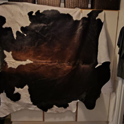 IKEA Koldby kohud matta i brun nyans med naturlig form. Mattan är tillverkad av kohud/läder med ljus baksida.