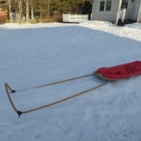Säljer nu min släde då den mest bara står numera. Den är fint skick och alltid stått inne under tak. Lätt och smidig, kört med 1-2 hundar. Den ska tydligen gå att fälla ihop men inget jag har provat själv. Om jag minns rätt så är den från axaeco men är inte helt säker.