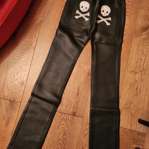 Här säljer jag en par byxor i latex/pvc/vinyl-material. Detaljer med remmar kring benen. Köptes för en herrans massa år sedan, märke: Lip Service. Passar S. Hämtas i Solna eller postas med fraktavgift. OBS säljer av massor av scenkläder, skor och annat i andra annonser. Passa på till sommarfestivalerna!