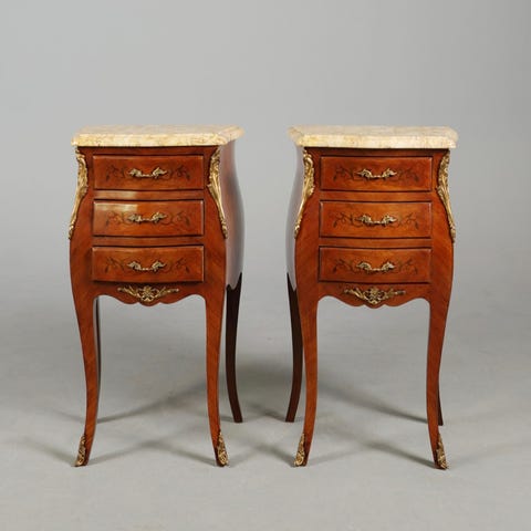 Ett par sängbord i Louis XVI-stil från första hälften av 1900-talet. Bord i massivt trä, nyligen målade och i väldigt fint skick – ser nästan nya ut. Fina mässingsbeslag.