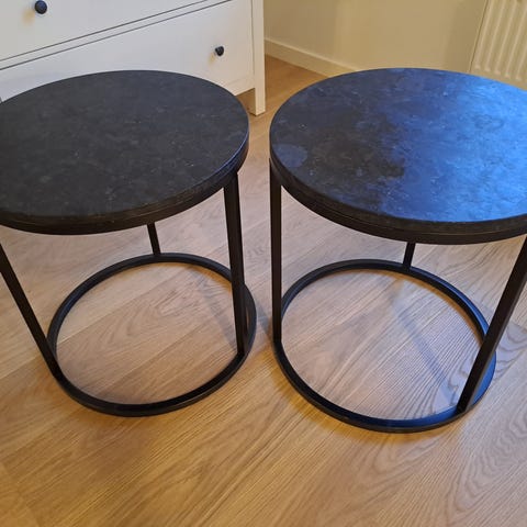 Soffbord i gustaviansk stil med träunderrede och massiv ölandsk kalksten. Stenskivan mäter 70×50×3 cm, bordshöjd 53 cm, underrede 66×45 cm. Något färgbortfall på underredet och ett runt märke på stenen, inget som stör i vardagen.