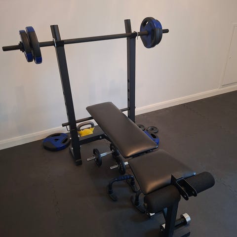 Hemmagym med träningsbänk, rack, skivstång och vikter
