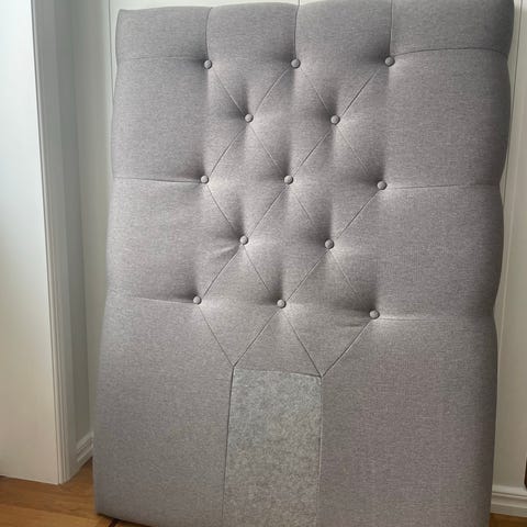 Sänggavel klädd i mörkgrått tyg. Sänggaveln är vadderad och har knapptuftad framsida. Baksidan har fästen för upphängning på väggskena, och separat väggbeslag syns på bild. Passar som huvudgavel till säng och ger en mjuk yta att luta sig mot.