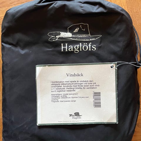 Vindsäck ca 1100 g ca 150x195. Kan rymma tre pers i nödläge. Särskilt användbar för att få lä vid raster, och sitta utomhus i solen i en snögrop. Självsydd