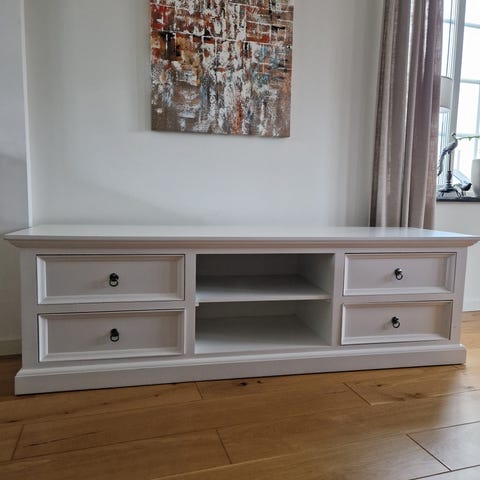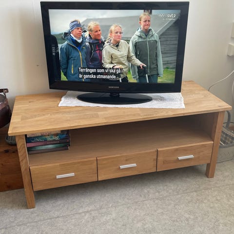 Tvbänk i ek, med hylla och lådor, hål för kablar på baksidan