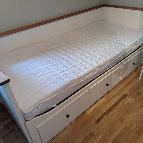 IKEA dagbädd i vit färg med tre utdragslådor för förvaring undertill. Sängramen har ryggstöd och sidor, vilket gör att den kan användas både som soffa och säng. Lådorna ger extra förvaringsutrymme för till exempel sängkläder eller textilier. Madrasser ingår.