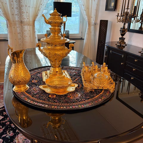 Elektrisk samovar från Iran, vattenkokare i mässingsfärgad metall med dekorativt reliefmönster. Utrustad med handtag, kran för tappning av varmt vatten och strömbrytare på foten. Passar för uppvärmning och servering av tevatten eller annat varmt vatten i kök eller vid servering.