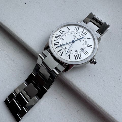 Cartier herrklocka med automatisk urverk. Klockan har rund boett i metall och ljus urtavla med romerska siffror och datumvisning. Levereras med textil- eller läderliknande armband monterat på klockan samt extra metallänk med viklås från Cartier. Passar som vardags- och dressklocka för herr.