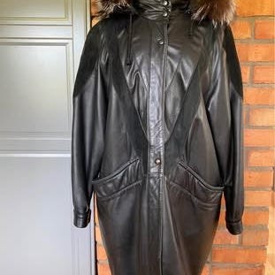 PG Leather Fashion Sweden skinnkappa för dam i svart läder, storlek 42. Svensk kappa i skinn som är tillverkad av P. G. Elfström i Malung. Kappan har huva med mörk pälskant och räcker ned över höfterna för extra täckning. Modellen har hellång dragkedja framtill och långa ärmar. Innerfodret är mönstrat med PG-logotyp. Passar som ytterplagg under kyligare årstider.