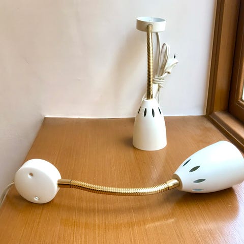 Retro vägglampa eller sänglampa från IKEA i björk. Sladdlängden går att justera så att själva lamphuvudet hänger på den höjd du vill. Den har en asymmetrisk skärm som jag tror är en skada (eller så är det jag som inte förstår mig på designen).
