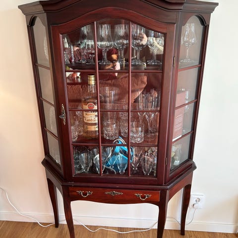 Vitrinskåp i trä med brun träfaner och dekorativa intarsiadetaljer. Skåpet har en mittdel med glasdörrar och hyllplan för förvaring och exponering av glas och porslin. På sidorna finns trädörrar med hyllor invändigt. Nederst finns en rad lådor för extra förvaring. Passar som förvaringsmöbel i vardagsrum, matsal eller kök.