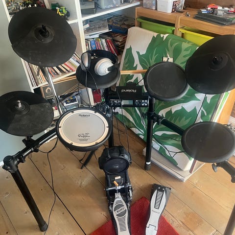 Alesis DM Lite el-trummor komplett med pall, pinnar och headset. Går även att koppla till en större högtalare/förstärkare för bättre ljud. Kostar ca 3500kr i butik. Säljs för 1500kr.