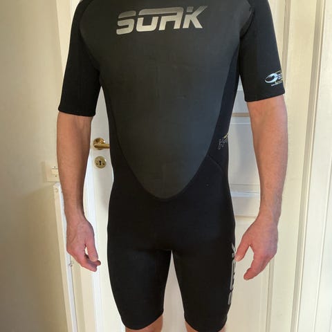 Svart/gul våtdräkt i två delar. Strl L dam, upplever den som rätt liten i storlek. Sparsamt använd. 600kr