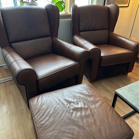 Säljer två stycken snygga fåtöljer i äkta skinn. De är riktigt sköna att sitta i ser bra ut.