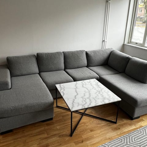 Soffa från Mio köpt för 15000 nu för 3000 kr , avtagbart klädsel. Klädskåpet i bra skick men det finns en liten spricka under. Tv skåpet och soffabord i bra skick.