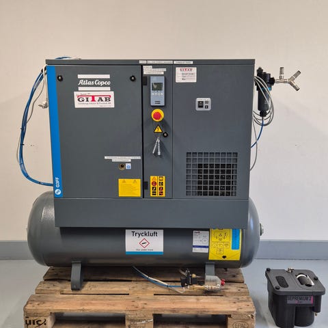 Jun-Air kompressor med rund grön tank och gul motorenhet. Utrustad med spiralformad orange luftslang och manometer. Passar för tryckluftsverktyg, rengöring med tryckluft och andra enklare tryckluftsarbeten i garage eller verkstad.