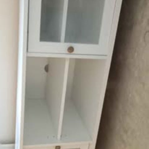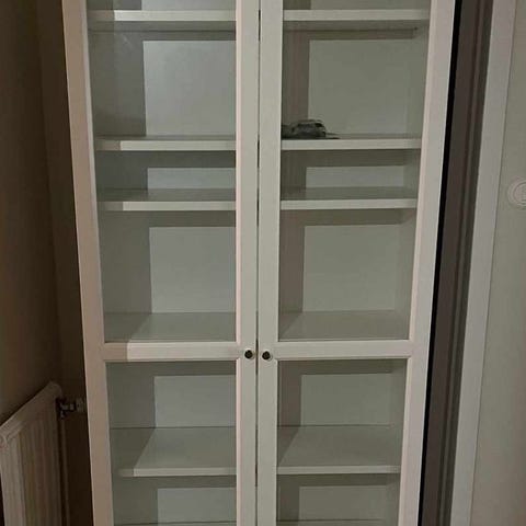 Billy hylla med dörrar och ett extra hyllplan ovanpå, fint skick men finns en ursågning på baksidan där det var en kontakt
