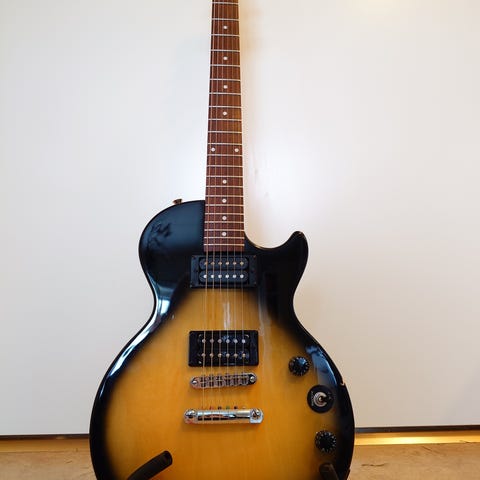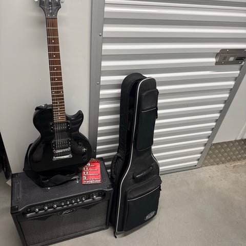 Epiphone Les Paul Special II elgitarr i svart utförande. Klassisk Les Paul‑kroppsform med två humbucker‑mikrofoner, volym- och tonkontroller samt treläges pickupväljare. Gitarren har greppbräda med inläggsmarkeringar och stämskruvar i metall. På bilderna syns även en mjuk gigbag med Epiphone‑logotyp, instrumentkabel och en kromatisk clip‑on‑stämmapparat med bruksanvisning. Passar för elgitarrspel i olika musikstilar.