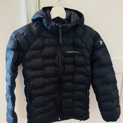 Peak Performance JR Argon Light Hood Jkt jacka i svart för barn/ungdom, unisex, storlek 164. Jackan är tillverkad i polyester med quiltad konstruktion och fast huva. Modellen har hel dragkedja framtill och sidofickor med dragkedja. Jackan är lättvadderad och passar för vardagsbruk och utomhusaktiviteter i svalare väder. Det finns en synlig reva i tyget på ena ärmen som kan behöva lagas.