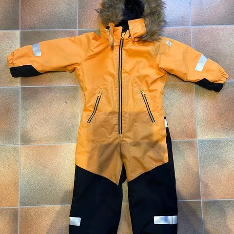 Overallen är inköpt 2024 och har använts under en säsong. Den är i mycket gott skick med endast mindre anmärkningar i form av en lätt naggad kant på reflexen på benet samt viss slitning på fotremmarna. Passar som ytterplagg för barn i cirka 1–1,5 års ålder, beroende på barnets längd.