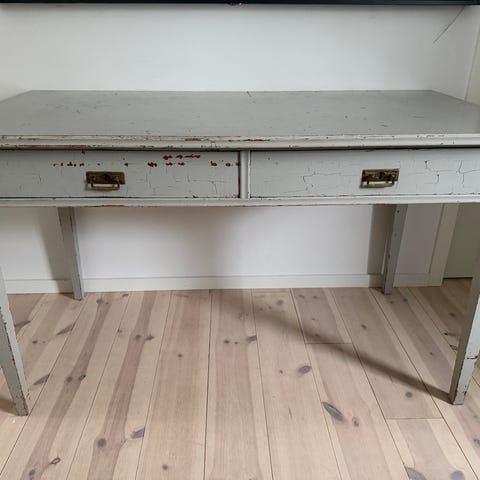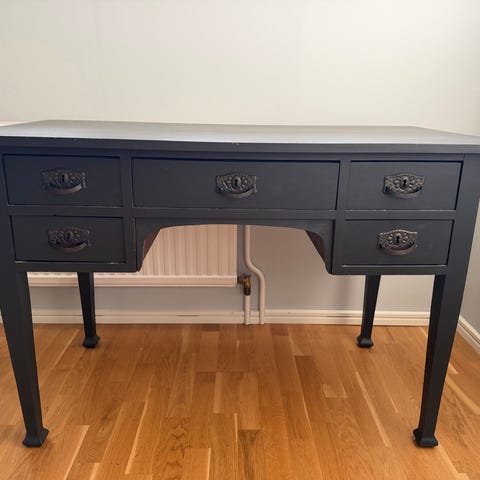 Skrivbord i trä med gråmålad yta. Bordet har fem lådor med metallhandtag, två mindre på vardera sida och en större i mitten. Ovansidan visar tydligt slitage och avskavd färg längs ena kanten. Passar som arbetsbord eller avlastningsbord i hemmiljö. Ingen känd märkning eller modellbeteckning syns på bilderna.