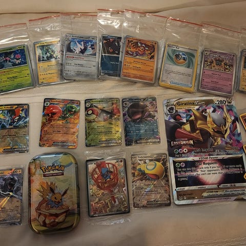Pokémon samling spelkort med blandade korttyper. Bilderna visar flera olika Pokémon-kort, inklusive större specialkort, tränarkort och kort med olika motiv. Samlingen innehåller även en plåtlåda med Pokémon-tema samt flera kort i plastfickor. Kortens exakta antal, serier och språk framgår inte fullt ut av bilderna, men det rör sig om en blandad samling med olika motiv och utgåvor. Produkten lämpar sig för samlare eller som komplettering till befintlig Pokémon-kortsamling. Inkl charizard.