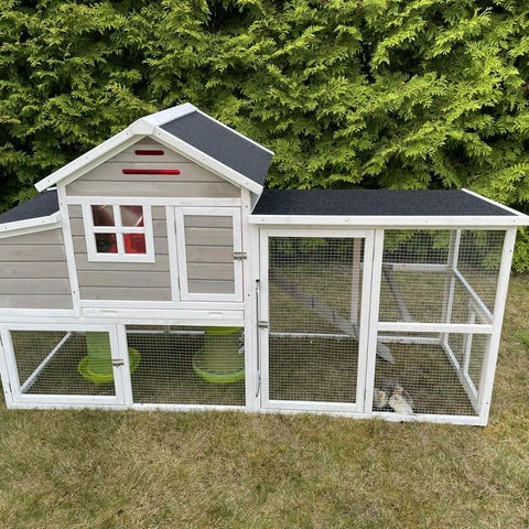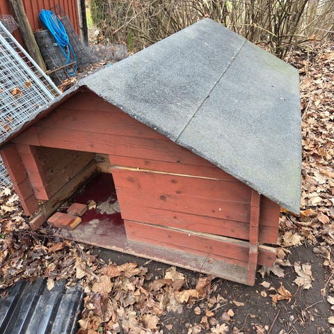 Hönshus och hönsgård i trä med nät. Anläggningen består av ett enklare hönshus med trätak samt en inhägnad utegård med trästomme och nät runtom, inklusive taknät. Hönshuset har dörr och fönster med nät för ventilation. Utegården har sittpinnar och grenar för hönsens aktivitet. Passar för hållning av höns eller andra mindre fjäderfän i trädgård eller på mindre gård. Vattentank, fodertunna, nät, tak, sektioner. Allting ingår. Kom med skäligt bud!
