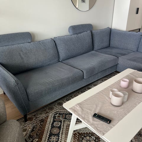 soffa med fotpall, ljusgrå, lite använd, fräsch