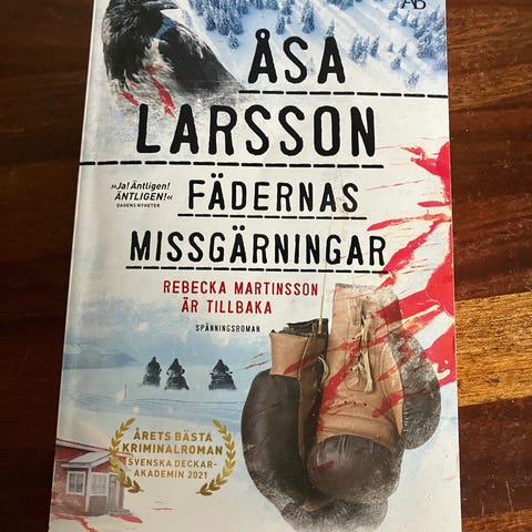 Åsa Larsson Fädernas missgärningar bok. Skönlitterär kriminalroman om Rebecka Martinsson. Tryckt på svenska, pocketupplaga med färgtryckt framsida och text på omslaget.
