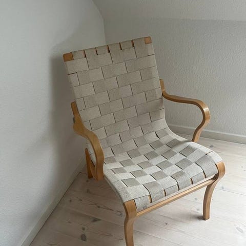 DUX fåtölj med vävd sits i naturfärgat band och trästomme Bruno Mathsson