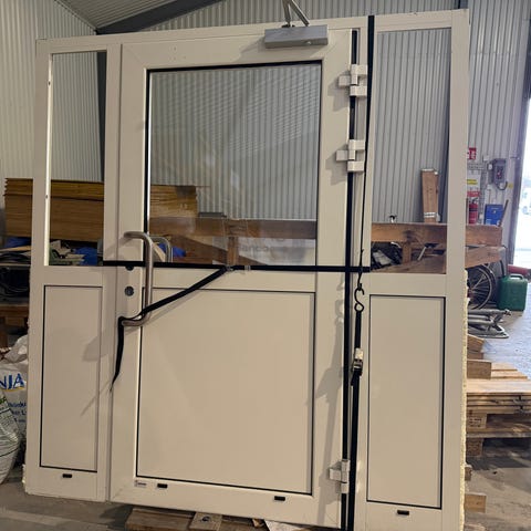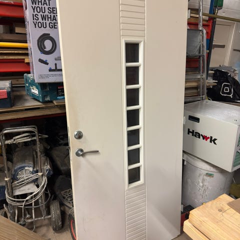 Dörren är inköpt 2022 har varit monterad en kortare period där yale doorman samt dörrbroms vart monterat (se bilden med små hål, går fint att spackla över). Jättefin dörr samman taget!