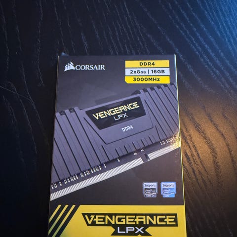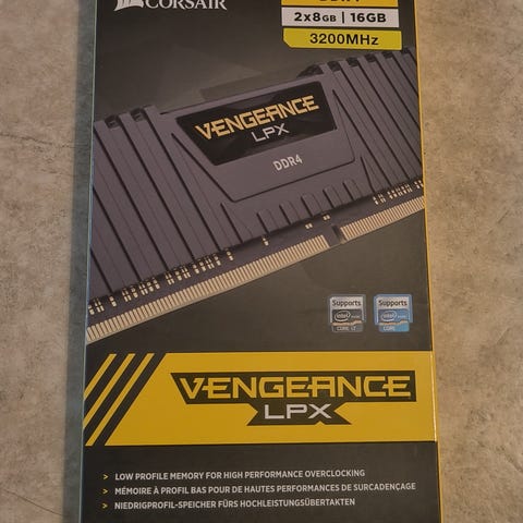 Corsair Vengeance LPX RAM-minne DDR4 med total kapacitet på 16GB fördelat på 2x8GB-moduler. Minnet har en hastighet på 3200MHz.