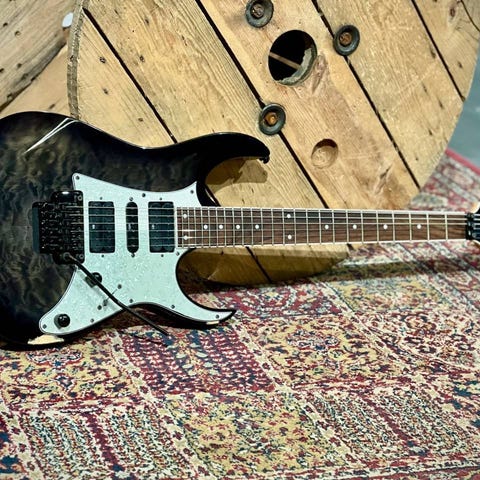 Ibanez sa270 i med kropp mahogny , lönnhals och mörk greppbrädan med vita markeringar. Kroppen har en lövtunn flammig lönnfaner i grågrönt samt att mickarna är uppgraderade till: en bra svensklindad paf mick i stalläge, singelcoil)alnico 5) i mitten och en bra stackad humbucker i hals.