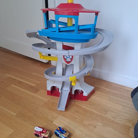 Paw Patrol lekset utkikstorn i plast, flerfärgad. Tornet har en rund bas med markerade parkeringsplatser i olika färger, en spiralformad rutschkana samt hissfunktion i mitten. Överst finns en plattform med kontrollpanel, ljusdetaljer, ljud och periskop.
