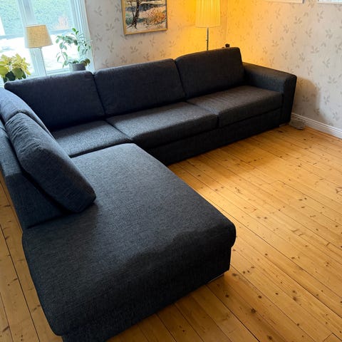 Säljer VIMLE 2-sits med schäslong, gråblå tyg, avtagbart tyg, fint skick.