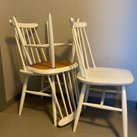 4 retro gröna pinnstolar, 1 stol behöver limmas i rygg stödet.