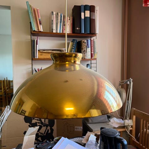 Denna vackra lampa i Mässing design av Einar Bäckström diameter 42 cm höjd 60 cm, fyra glödlampor.