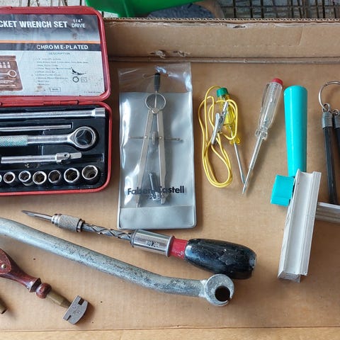 Fasta tunna nycklar, vridna skruvmejslar, dorn, håltång, filar mm