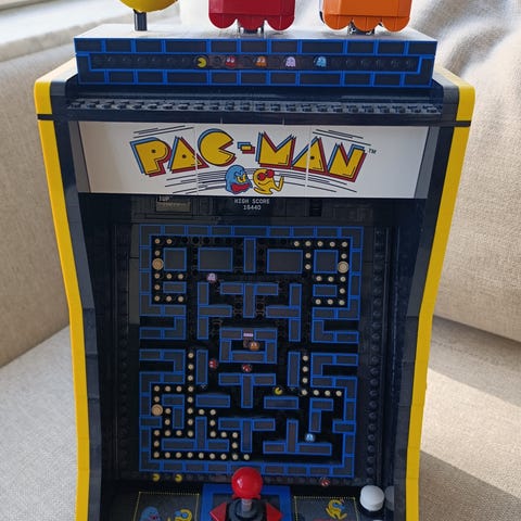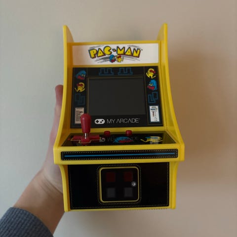 My Arcade Pac-Man arkadspel i miniformat. Kabinett i gul plast med Pac-Man-motiv på sidorna. Utrustad med liten skärm, joystick och knappar på fronten. Batterifack på baksidan samt högtalare och strömbrytare. Lämplig som bordsmodell eller samlarobjekt för arkad- och retrospel.