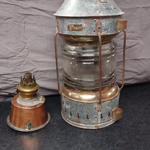 Stomme i mässing, blyinfattat glas, fasettslipat glas, höjd ca 55 cm. Saknar kedjor och ljusanordning. En tidigare såld har Proveniens stallet på K1. 850 kr, hämtas på plats.